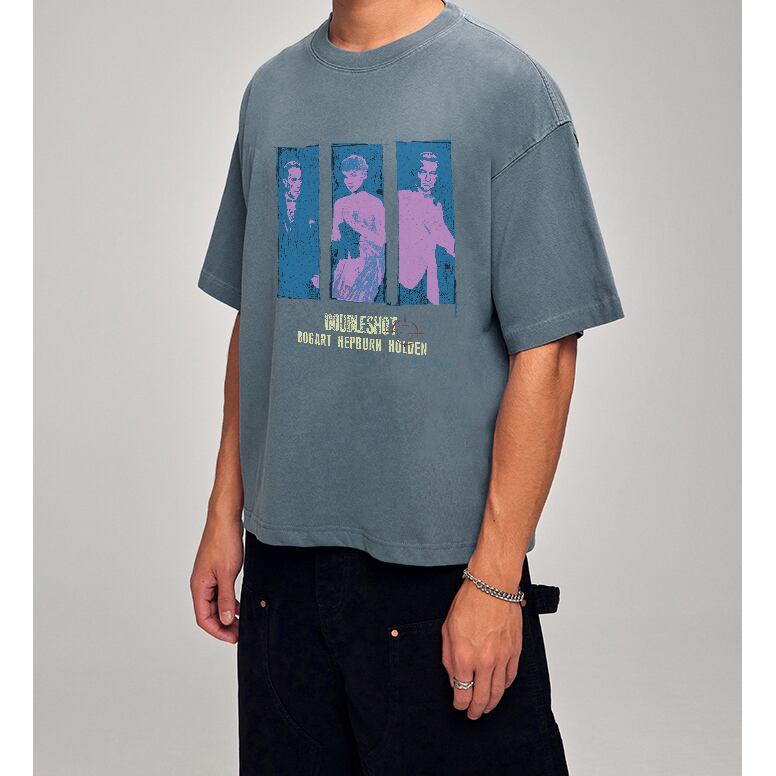 最近大人気のショート丈Tシャツに、ヴィンテージ風プリントを組み合わせた一枚。