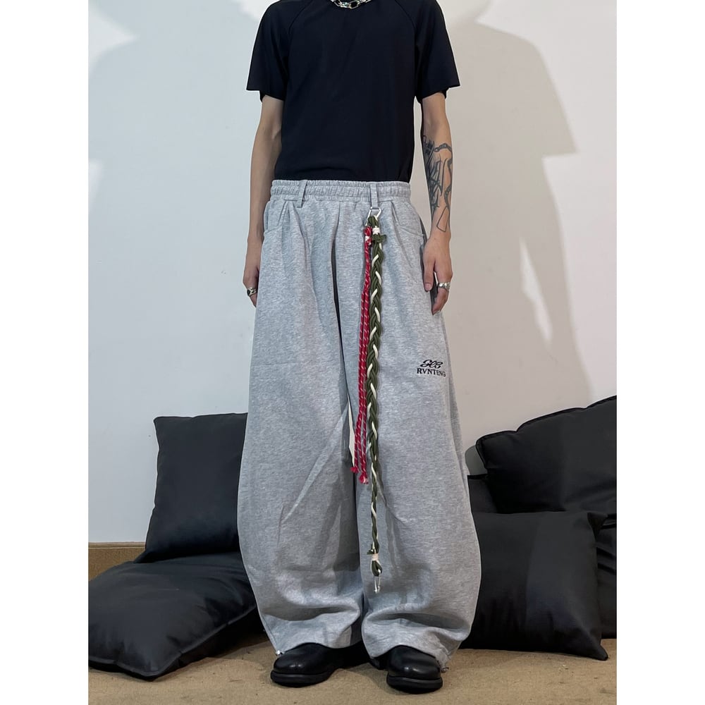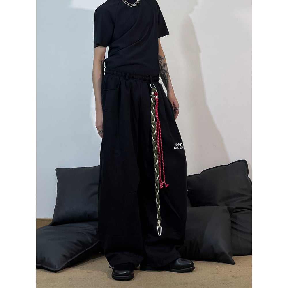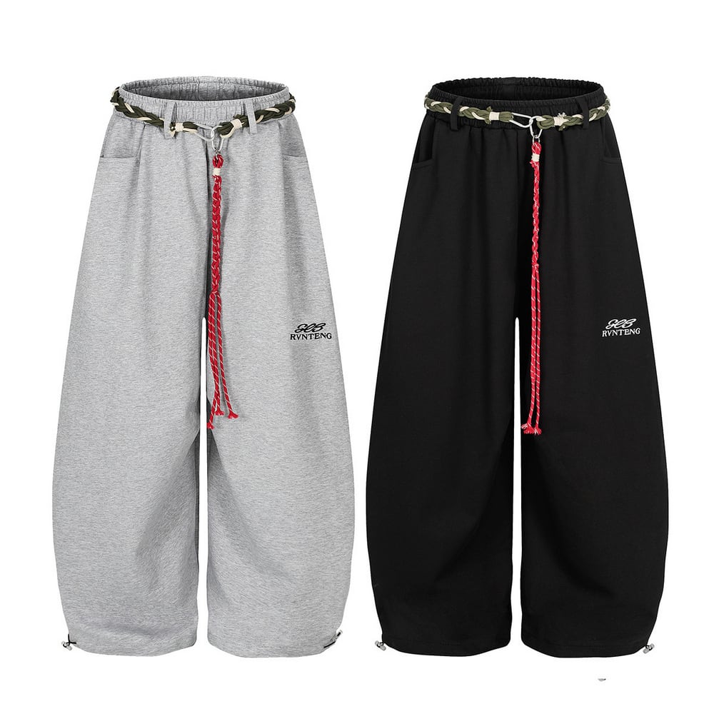 ユニセックスで着用できる迷彩ベルト付きスウェットパンツ。