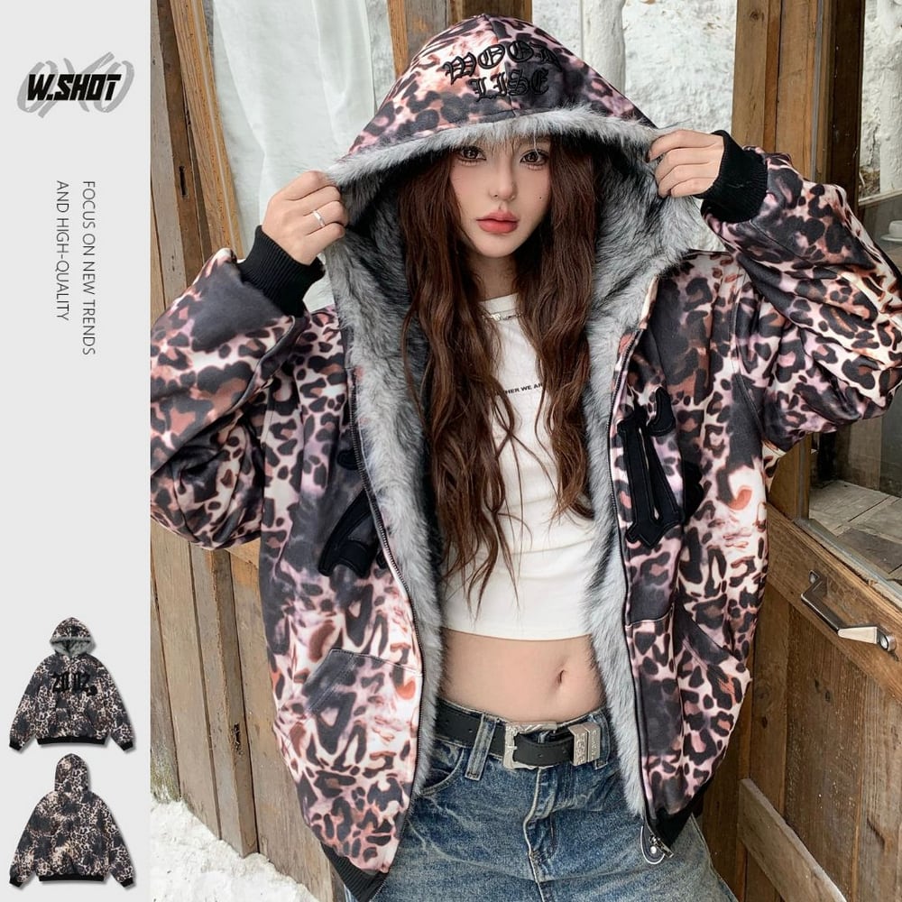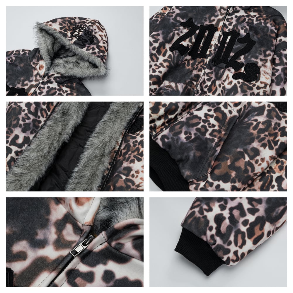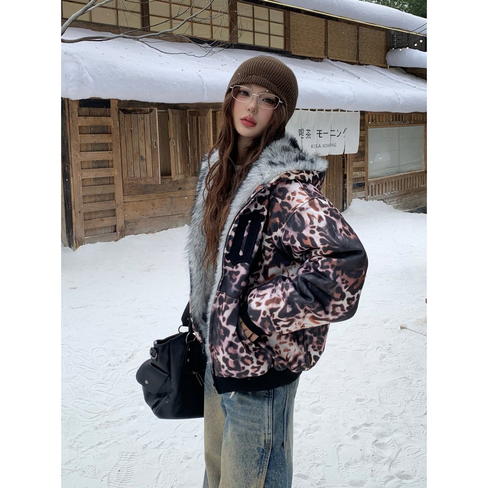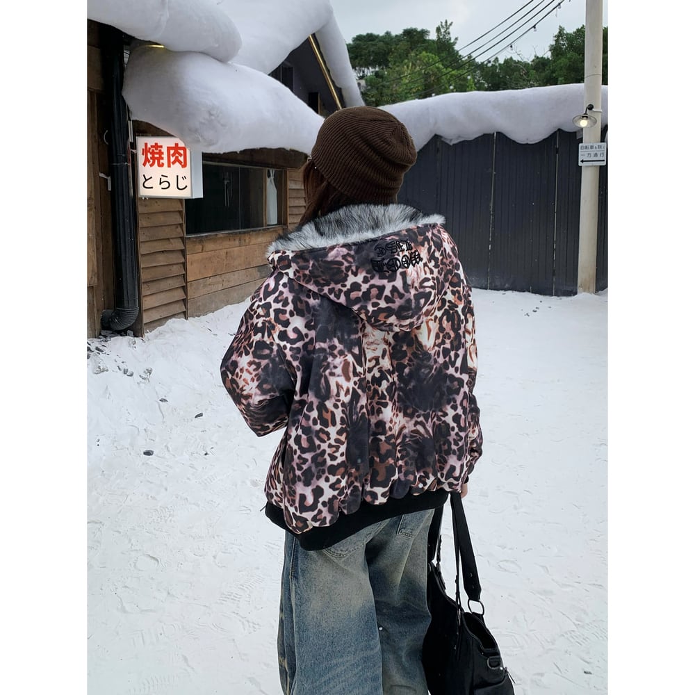 【暖かさUP】ヒョウ柄ファー中綿ジャケット T1963