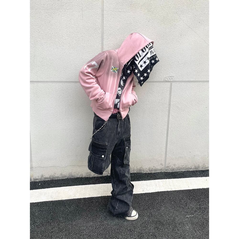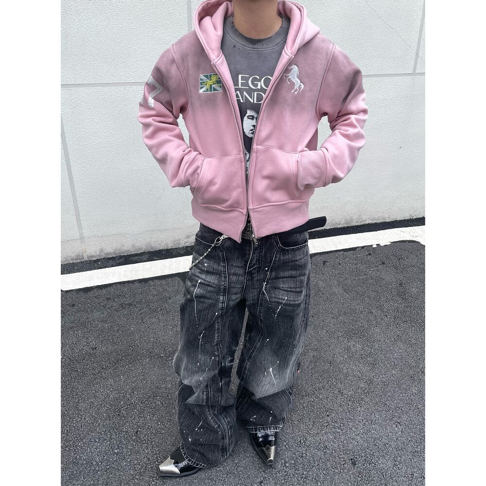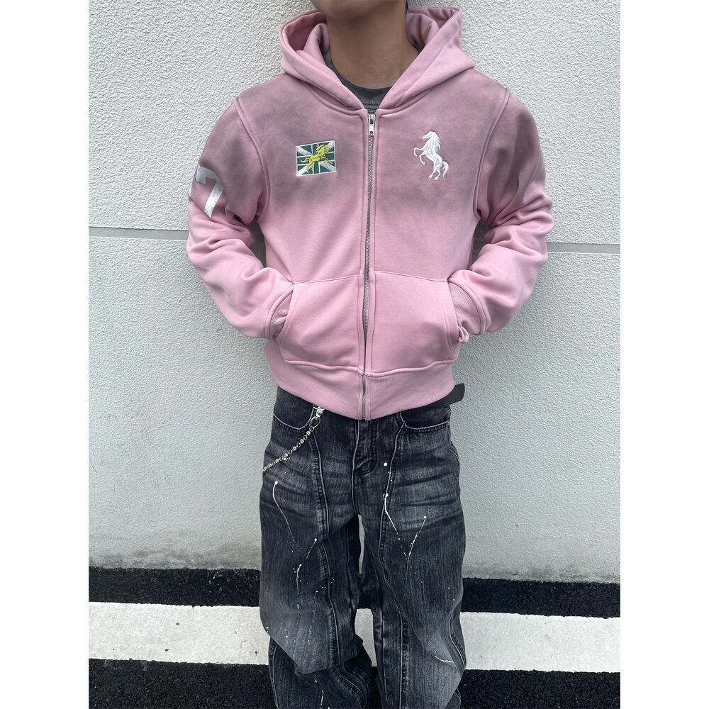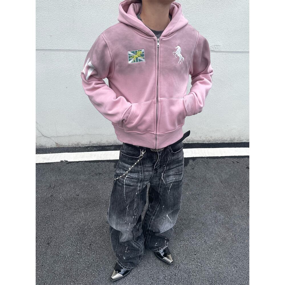 VINTAGE ストリート 裏起毛 汚れ加工ピンクジップパーカー T1991