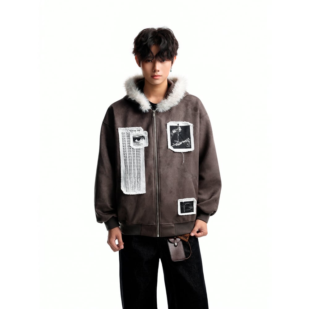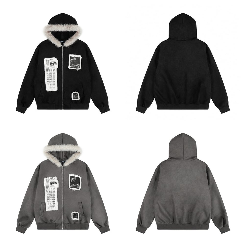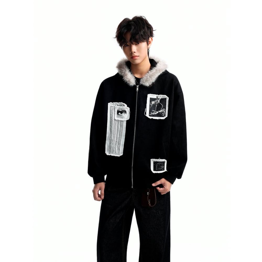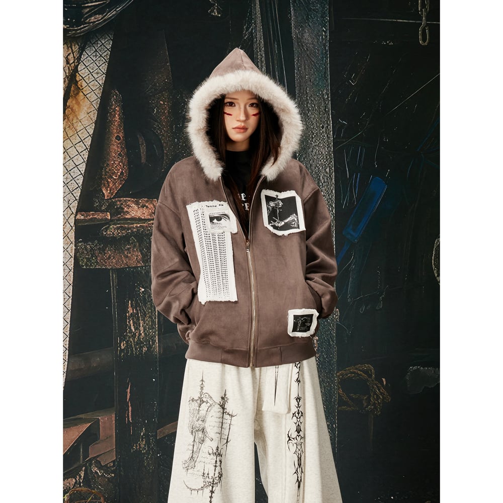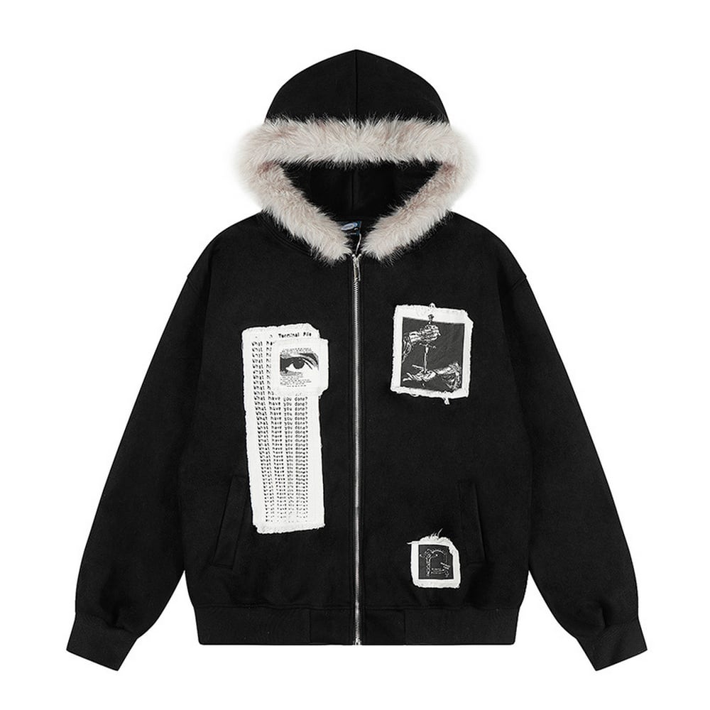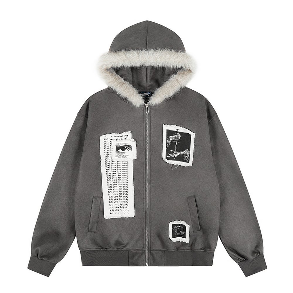 ストリート ファーカラーパッチプリント ジップパーカー T2021