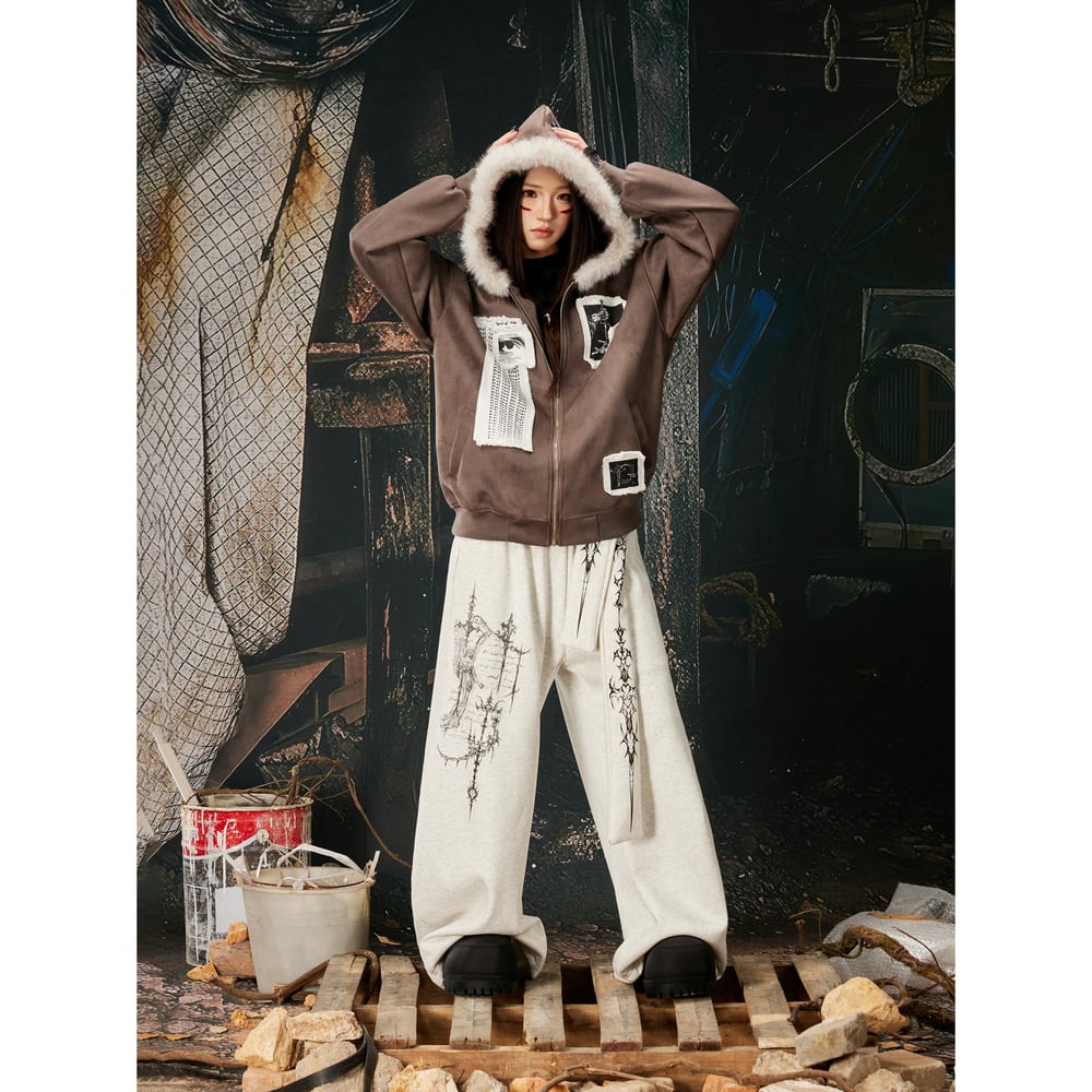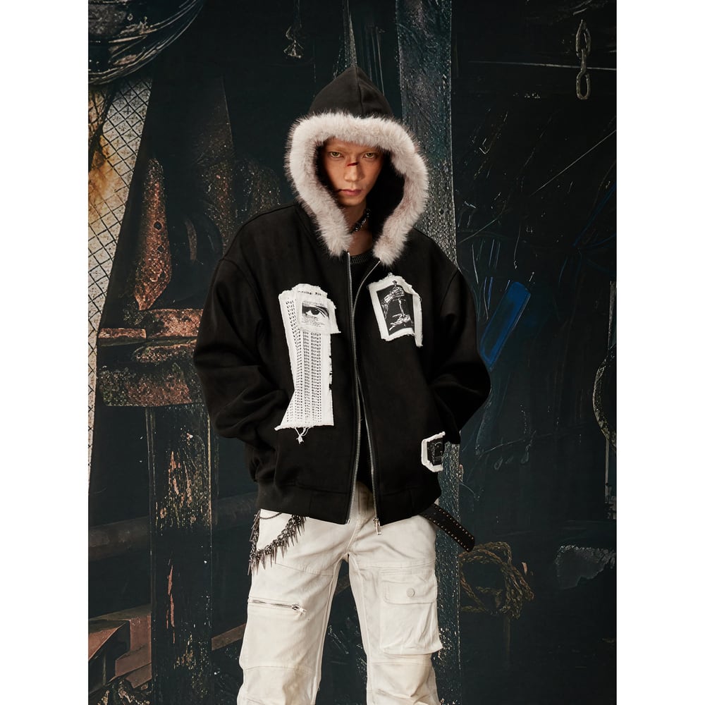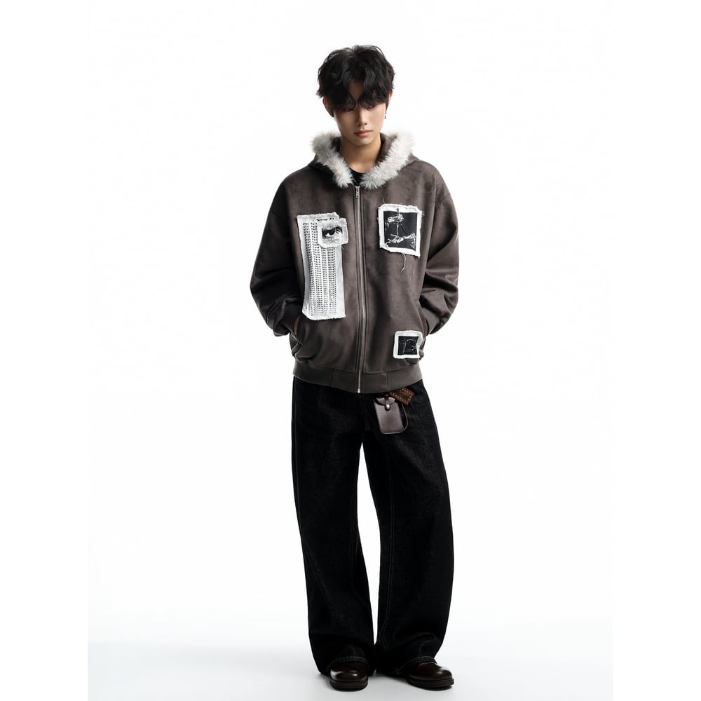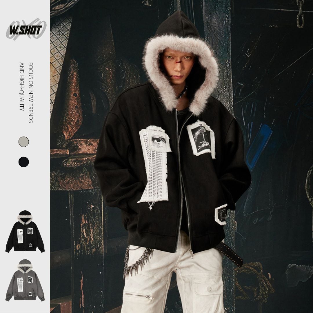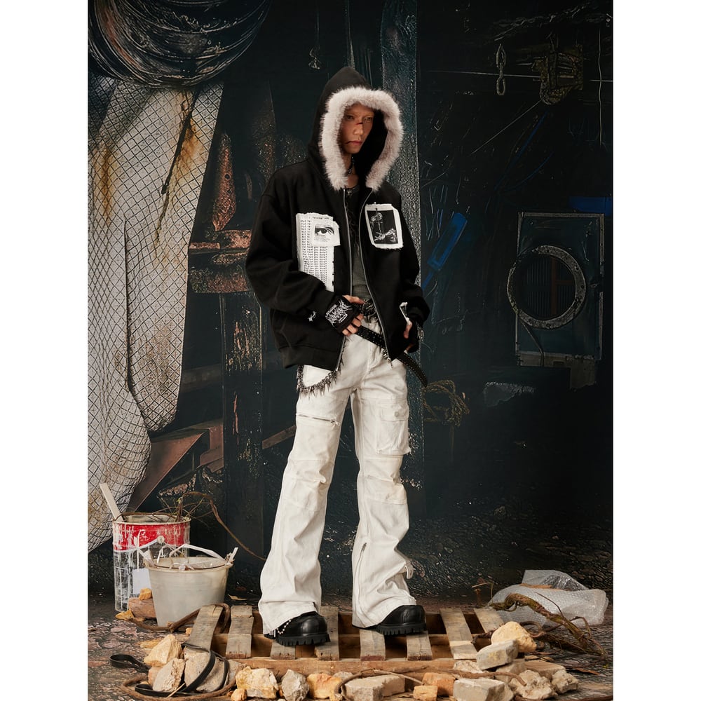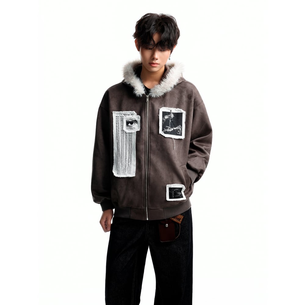 ストリート ファーカラーパッチプリント ジップパーカー T2021