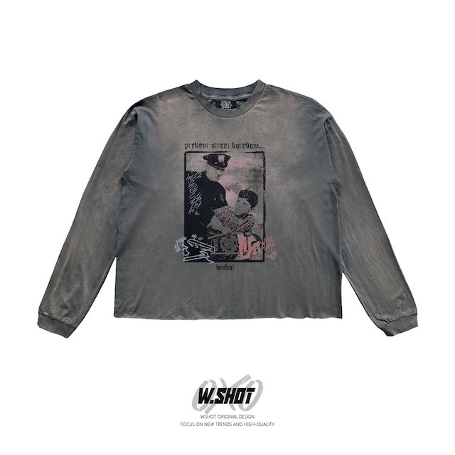 短丈シルエットの薄手ダメージVintageロングTシャツ。