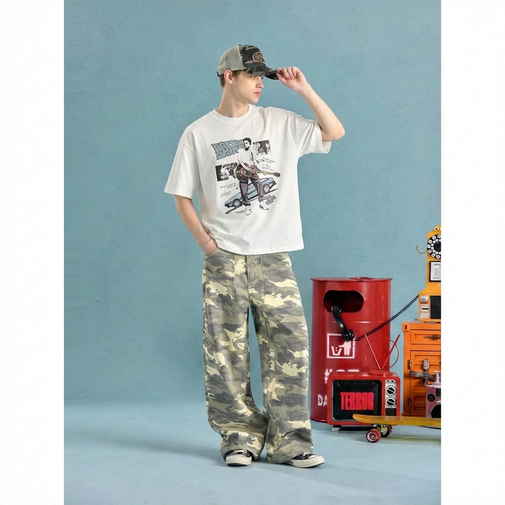 最近大人気のショート丈Tシャツに、ヴィンテージ風プリントを組み合わせた一枚。