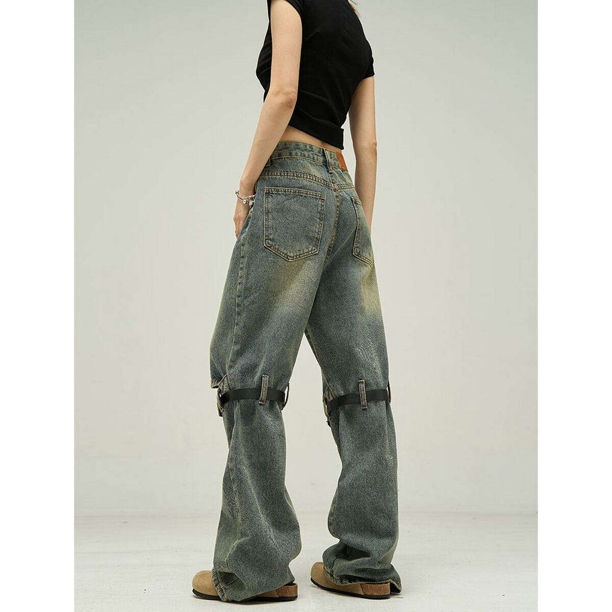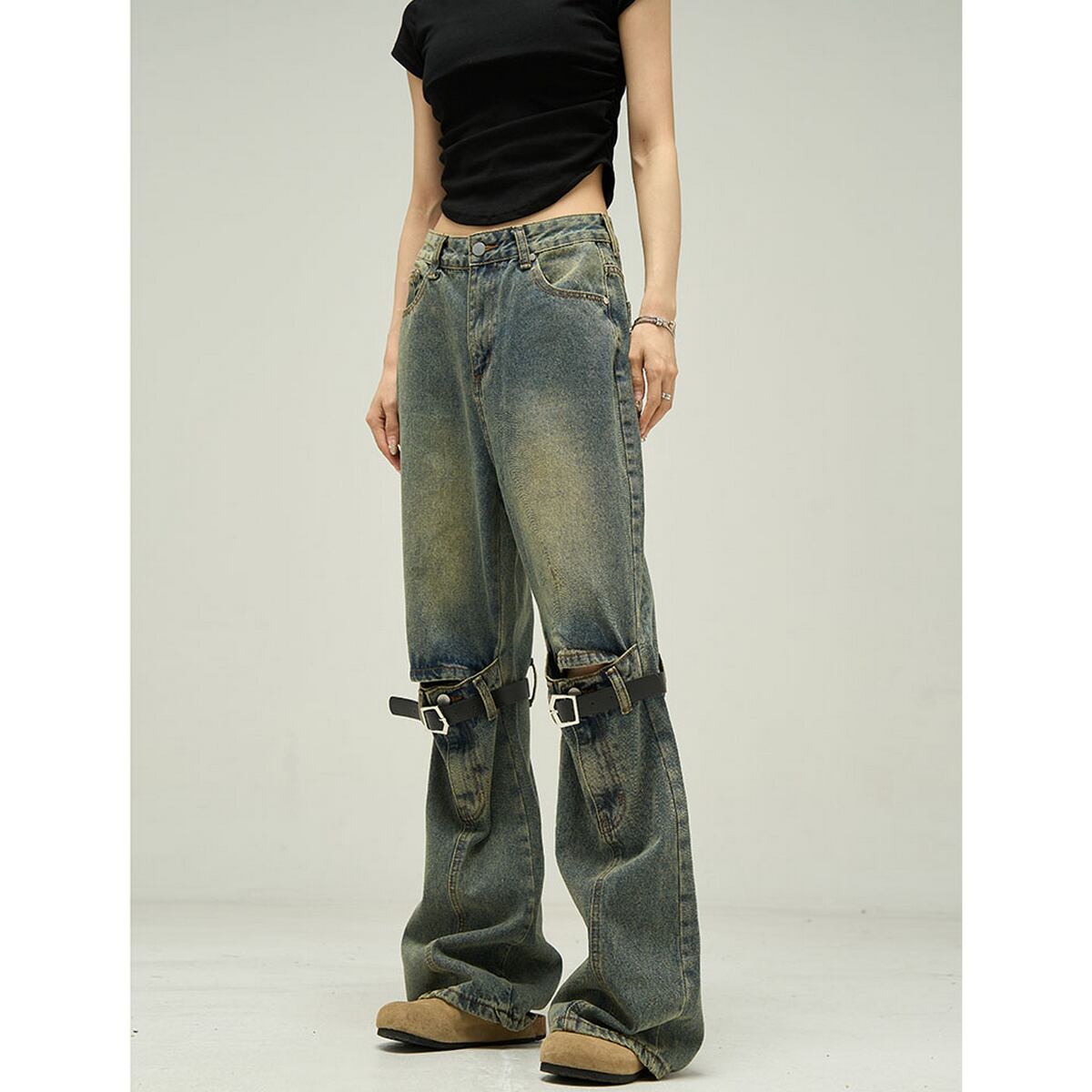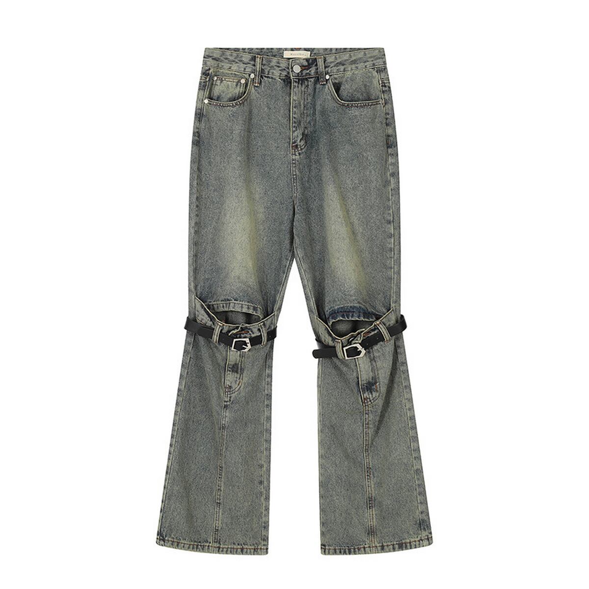 ストリート ウォッシュド加工 ベルト デニムパンツ P227