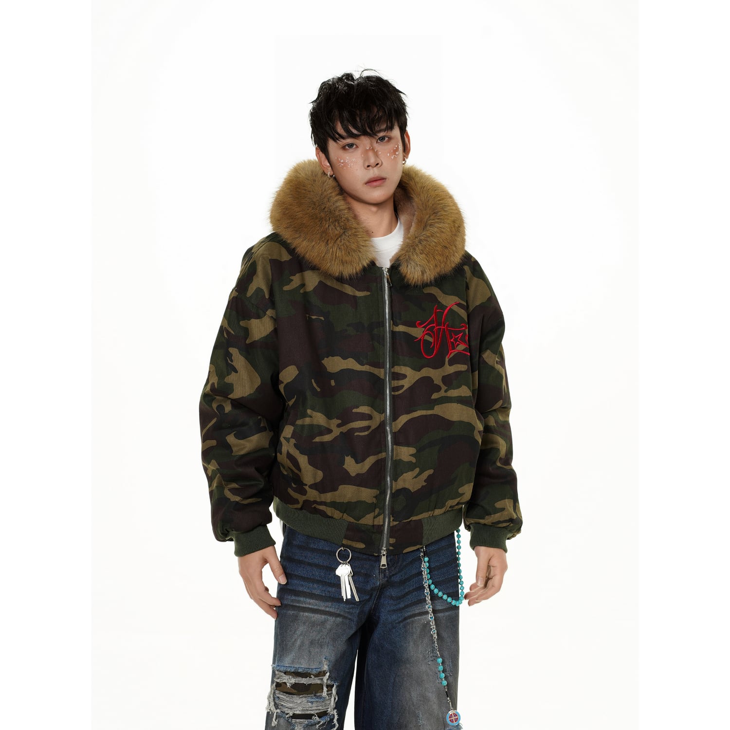 【暖かさUP】ファー迷彩刺繍 中綿ジャケット T1407